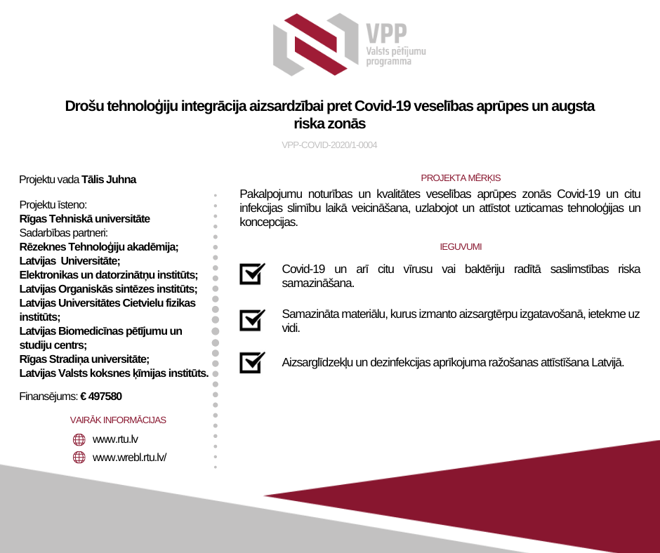 Projektā vadošie Latvijas zinātnieki un inženieri no deviņām vadošajām Latvijas universitātēm un zinātniskajiem institūtiem izstrādās progresīvus risinājumus COVID-19 seku mazināšanai, kas pielietojami veselības aprūpes un citās augsta riska zonās, piemēram, sabiedriskajā transportā. Projekts risina visas MK Noteikumu Nr. 560 Covid-19 seku mazināšanai 6.7. uzdevuma tēmas. Projekta vispārējais mērķis ir uzlabot pakalpojumu noturību un kvalitāti veselības aprūpes zonās COVID-19 un citu infekcijas slimību laikā, uzlabojot un attīstot uzticamas tehnoloģijas un koncepcijas. Projekta rezultāti atvieglos veselības aprūpes speciālistu, sabiedrisko pakalpojumu un visas sabiedrības labklājību, samazinot darba slodzi, veselības riskus, ar darbu saistīto stresu un pakalpojuma sniegšanas laiku. Projekta zinātniskie rezultāti tiks publicēti zinātniskos rakstos starptautiskos zinātniskos žurnālos un pēc iespējas tiks prezentēti zinātniskās konferencēs un nacionālajos semināros, jo īpaši, lai informētu mērķauditoriju. Izstrādāto tehnoloģiju prototipi tiks demonstrēti vismaz vienā no Latvijas slimnīcām. Projekta īstenošana paredz arī studentu un jauno zinātnieku iesaistīšanos pētniecībā, jo viņi tiks pārstāvēti gandrīz visu projekta partneru iesaistītajā personālā.