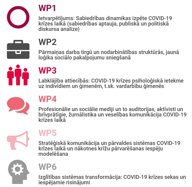 Mūsu projekta struktūra ir balstīta uz sešiem tematiskiem virzieniem kā sešām darba grupām (WP1–WP6) un visa projekta administratīvi koordinējošo vienību (WP0). Katru darba grupu veido pētnieki no dažādām institūcijām, jo tas ļauj visefektīvāk apvienot unikālu pieredzi, zināšanas, resursus un datus ar mērķi rast atbildes uz tiem jaunajiem jautājumiem, kurus mums šobrīd uzdod jaunā dzīve ar COVID. Mūsu starpdisciplinārā pieeja izveidota, lai mēs varētu novērtēt COVID ietekmi uz Latvijas sabiedrību. Turklāt šī ietekme nebūt nav viendabīga, bet gan, gluži otrādi, daudzveidīga, vairākos līmeņos un bieži vien arī ļoti pretrunīga. Katra atsevišķa mūsu projekta zinātnieku darba grupa darbojas gan kā autonoma zinātniskā vienība, gan arī vienlaikus cieši sadarbojas ar pārējām.