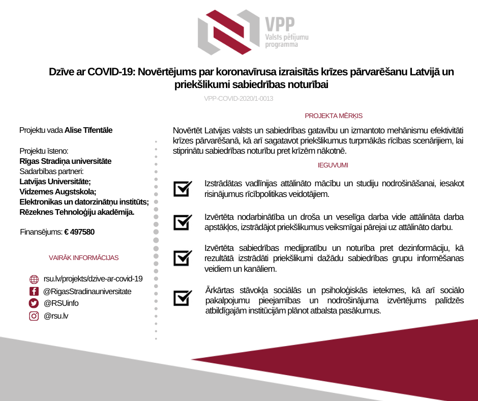 - Rēzeknes Tehnoloģiju akadēmija: Dzīve ar COVID-19: Novērtējums par koronavīrusa izraisītās krīzes pārvarēšanu Latvijā un priekšlikumi sabiedrības noturībai nākotnē (COVIDzīve) Nr. VPP-COVID-2020/1-0013 (25.08.2020.)