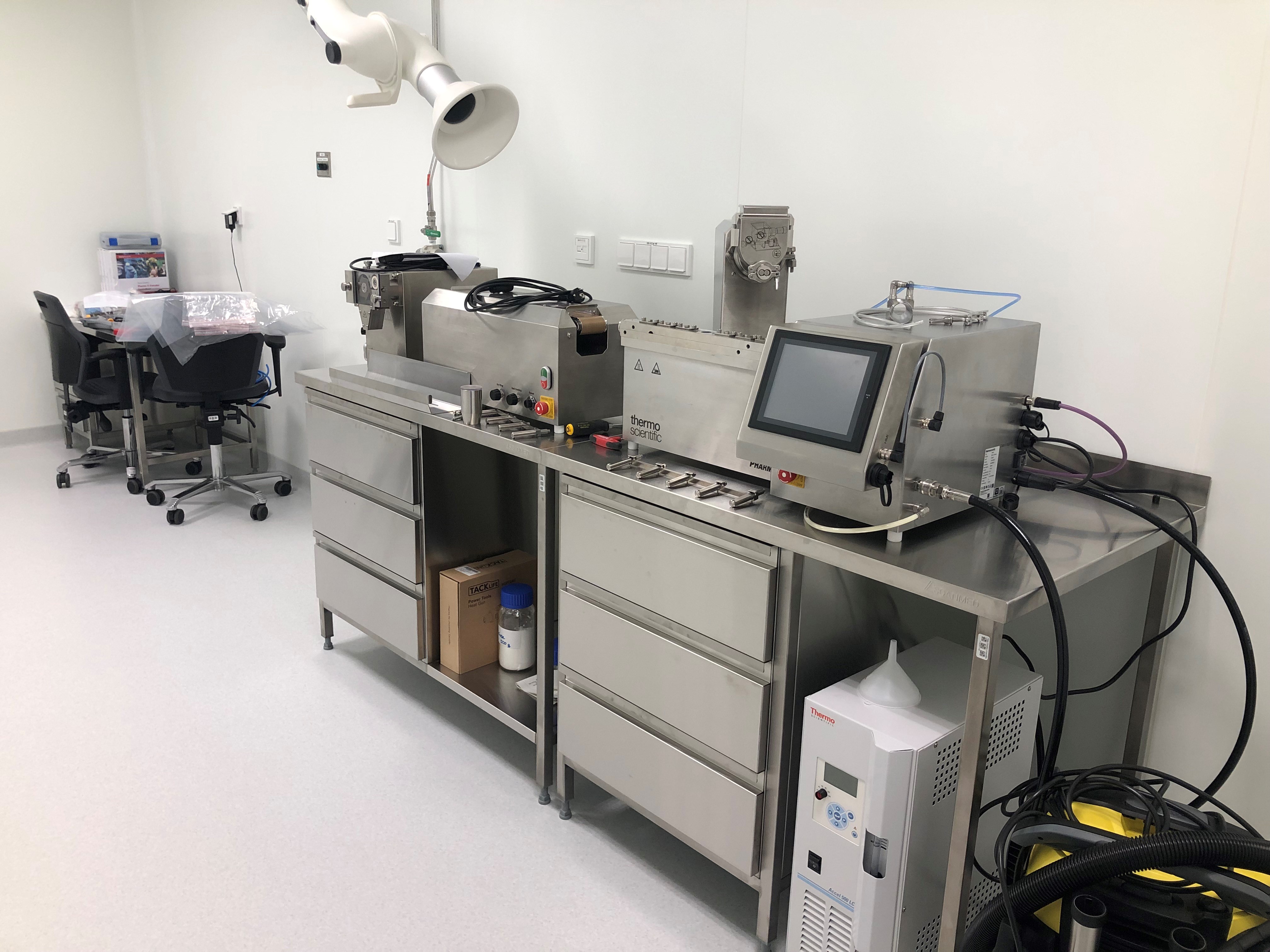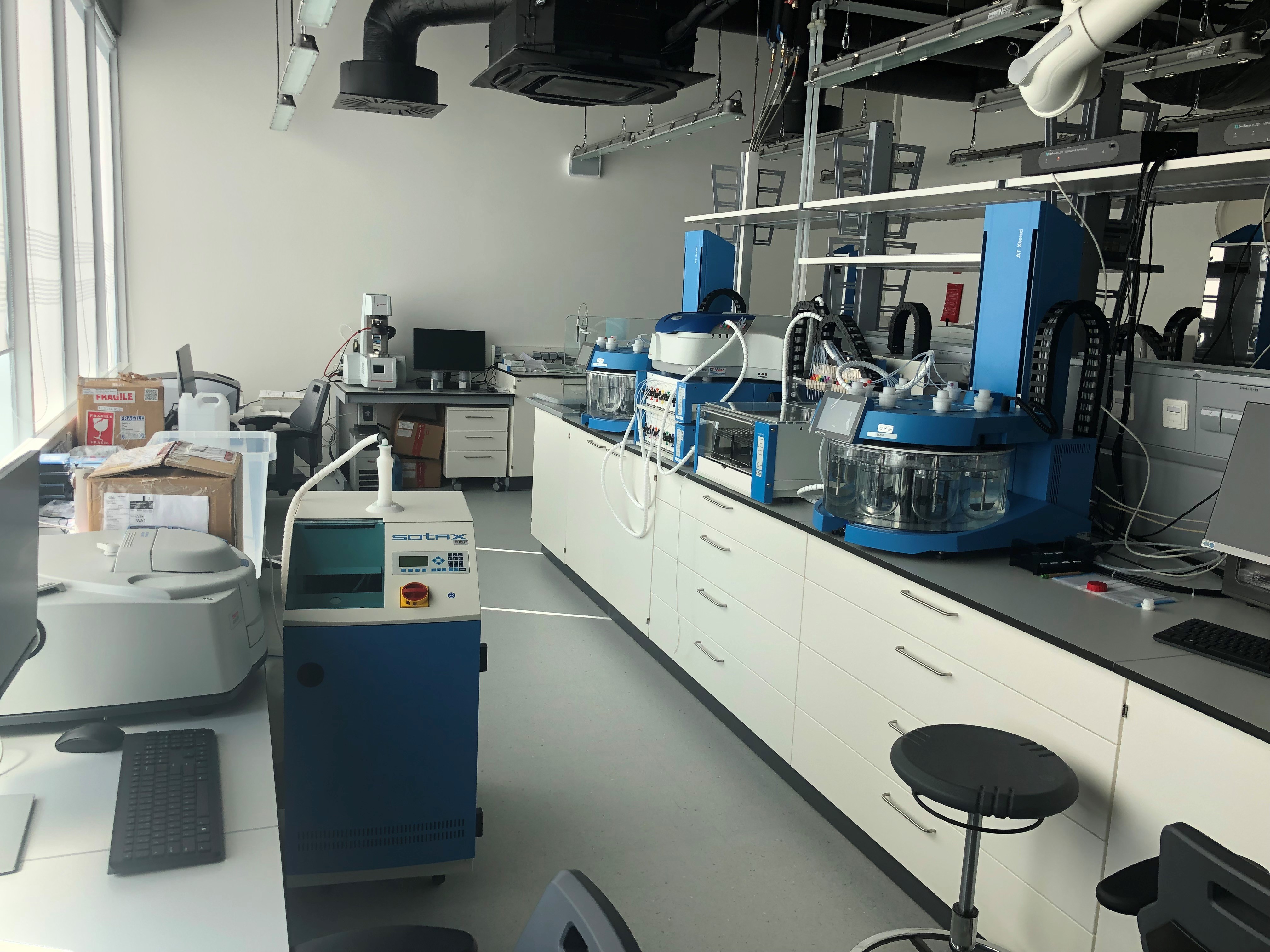Farmaceitiskās analīzes laboratorija (šķīšanas iekārtas, reometrs, UV-Vis un FTIR spektrofotometri un citas iekārtas).
