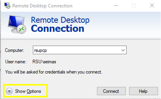 2.1. atveroties Remote Desktop Connection, spiediet uz Show Options.