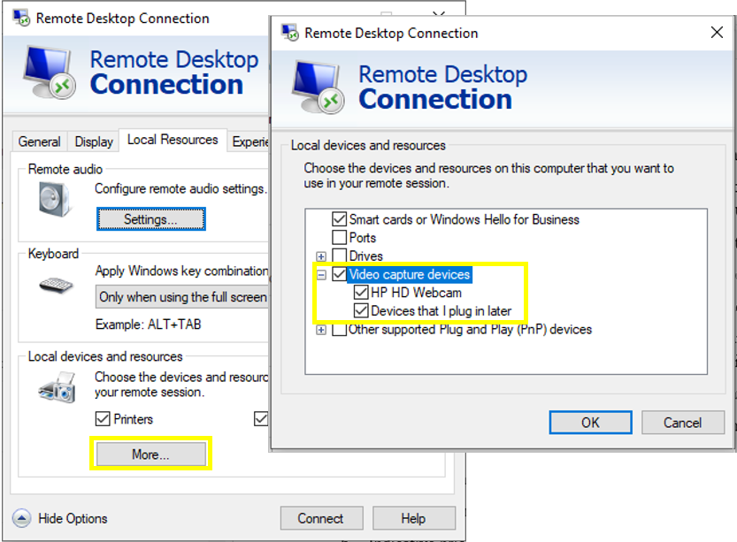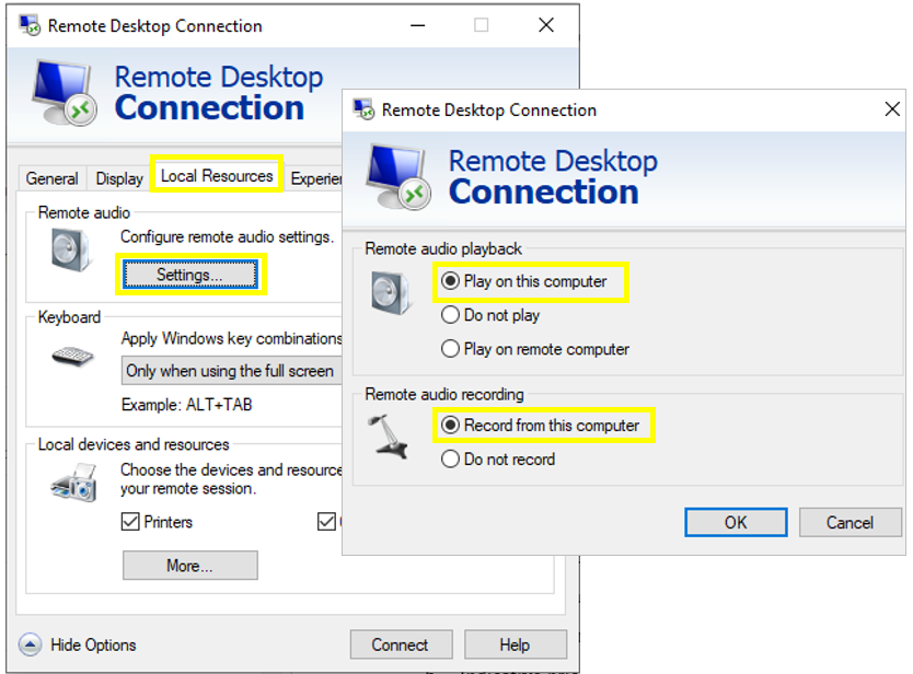 Skaņas un video iestatīšana, izmantojot Remote Desktop connection