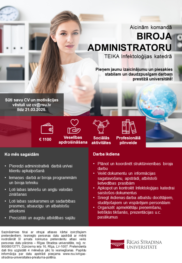 Struktūrvienība vai projektsInfektoloģijas katedraPieteikšanās līdz21.03.2025.Darba alga (bruto)EUR 1100Vietu skaits1Mēs piedāvājam