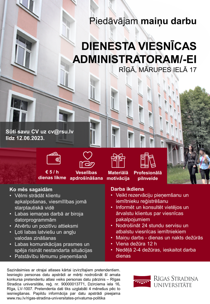 Struktūrvienība vai projektsDienesta viesnīca ĀgenskalnāPieteikšanās līdz12.06.2023.Darba alga (bruto)EUR 5 / h dienas likmeVietu skaits1Mēs piedāvājam