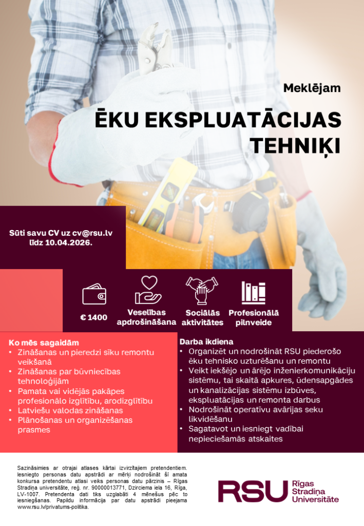 Struktūrvienība vai projekts Tehniskā un transporta pakalpojumu nodaļaPieteikšanās līdz10.04.2026.Darba alga (bruto)EUR 1400Vietu skaits1Mēs piedāvājam Tehniskā un transporta pakalpojumu nodaļaRSU centrālā ēkaDzirciema iela 16, RīgaTelpa: G korpuss, 1. stāvsTālrunis: +37167409077Skatīt kartē