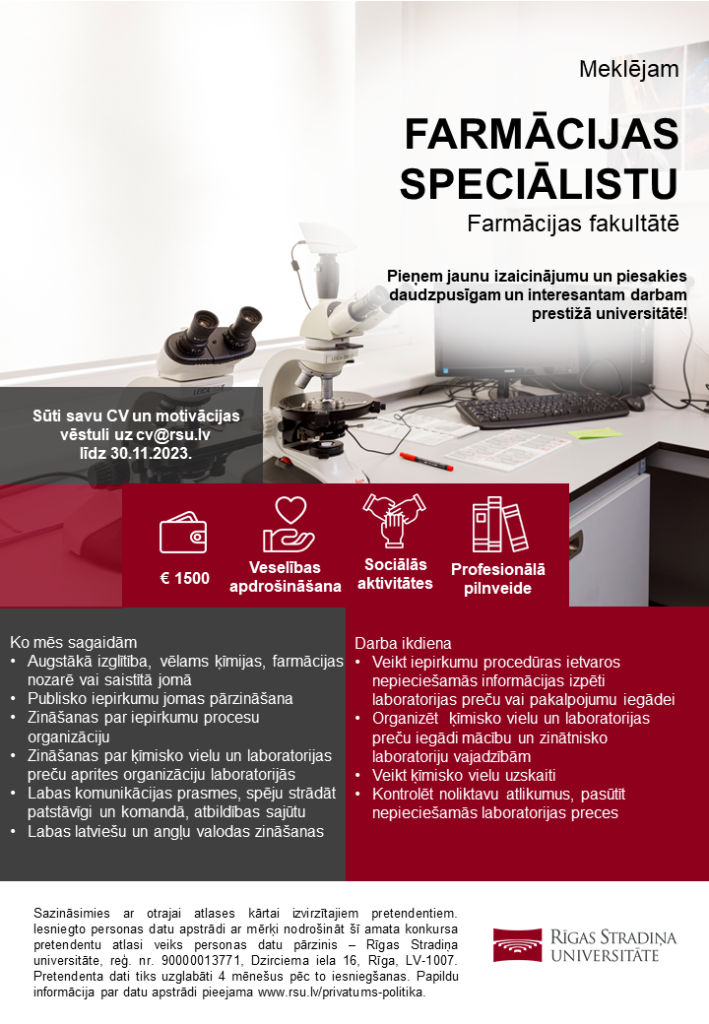 Struktūrvienība vai projektsFarmācijas fakultātePieteikšanās līdz30.11.2023.Darba alga (bruto)1500 EURVietu skaits1Mēs piedāvājam