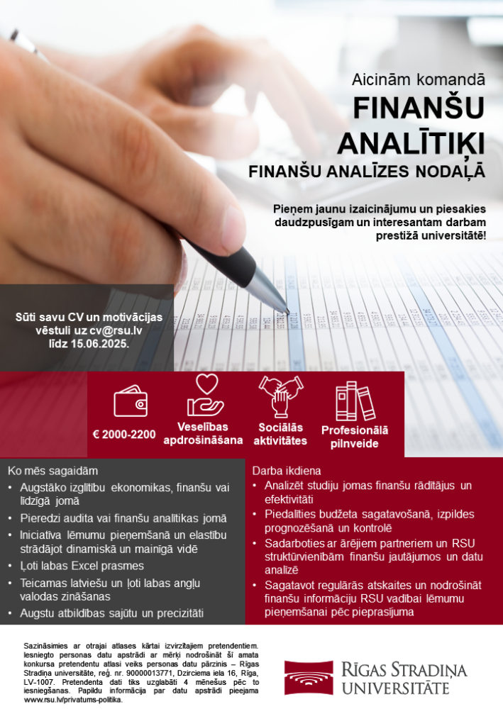 Struktūrvienība vai projektsFinanšu analīzes nodaļaPieteikšanās līdz15.06.2025.Darba alga (bruto)EUR 2000 - 2200Vietu skaits1Mēs piedāvājam Finanšu analīzes nodaļaFinanšu departamentsMellužu iela 17, RīgaTelpa: 203.-205.Tālrunis: +37167062738E-pasts: plans [at] rsu.lvSkatīt kartē