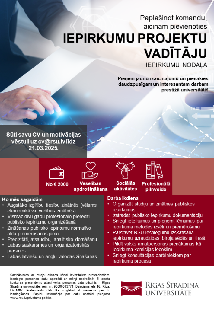 Struktūrvienība vai projektsIepirkumu nodaļaPieteikšanās līdz22.04.2025.Darba alga (bruto)no EUR 2000Vietu skaits1Mēs piedāvājam Iepirkumu nodaļaIepirkumu nodaļaRīga, Kapseļu iela 23Skatīt kartē