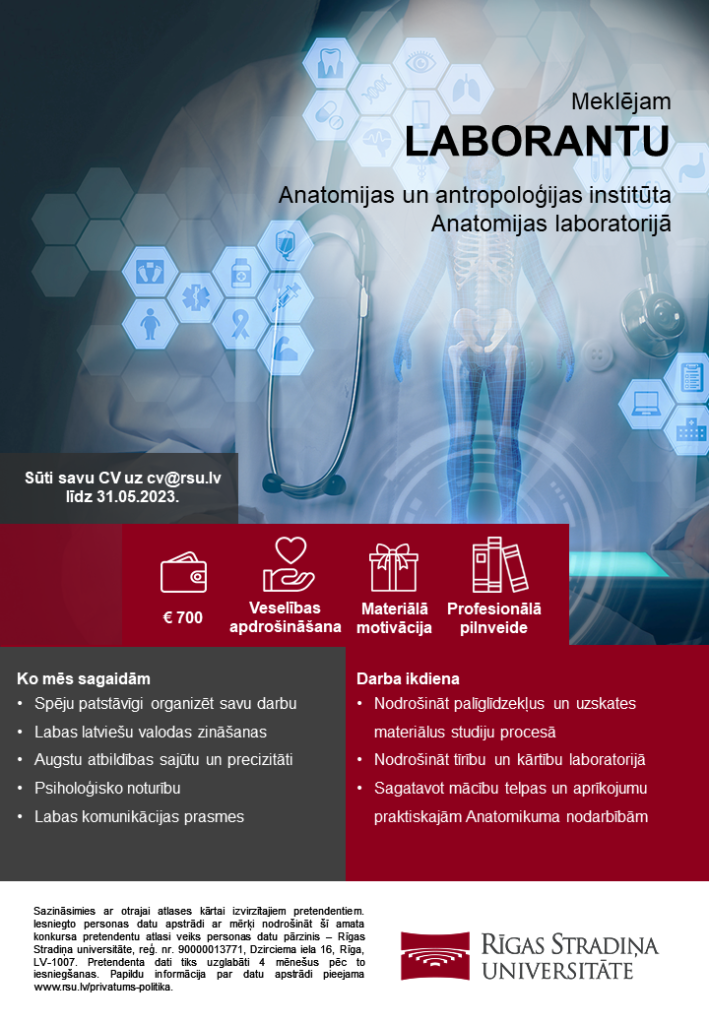 Struktūrvienība vai projektsAnatomijas laboratorijaPieteikšanās līdz31.05.2023.Darba alga (bruto)EUR 700Vietu skaits1Mēs piedāvājam