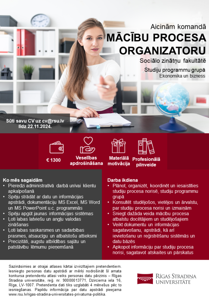 Struktūrvienība vai projektsSociālo zinātņu fakultātePieteikšanās līdz22.11.2024.Darba alga (bruto)EUR 1300Vietu skaits2Mēs piedāvājam