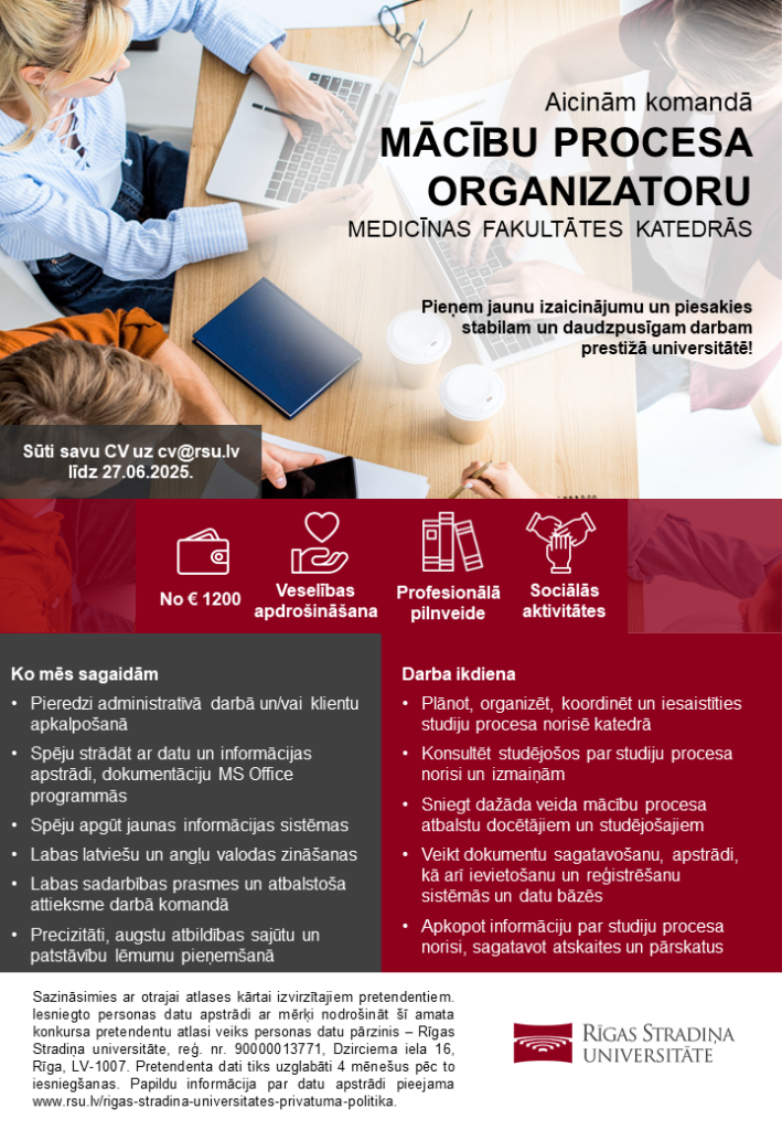 Struktūrvienība vai projektsMedicīnas fakultātePieteikšanās līdz27.06.2025.Darba alga (bruto)No EUR 1200Vietu skaits2Mēs piedāvājam
