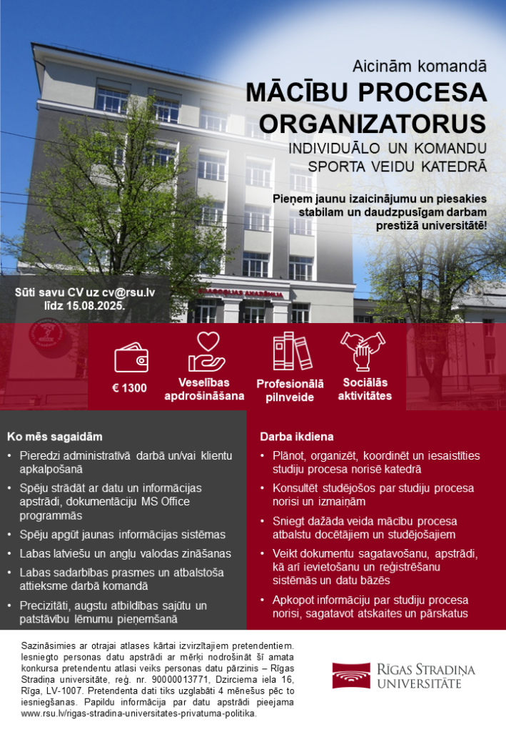 Struktūrvienība vai projektsRSU Latvijas Sporta pedagoģijas akadēmijaPieteikšanās līdz15.08.2025.Darba alga (bruto)EUR 1300Vietu skaits2Mēs piedāvājam RSU Latvijas Sporta pedagoģijas akadēmijaRSU LSPARīga, Brīvības gatve 333Tālrunis: +37129323829 E-pasts: lspa [at] rsu.lv Skatīt kartē