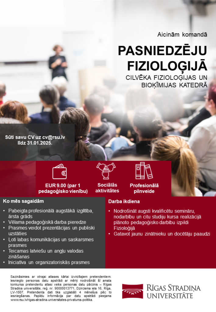 Struktūrvienība vai projektsCilvēka fizioloģijas un bioķīmijas katedraPieteikšanās līdz19.01.2025.Darba alga (bruto)9,00 EUR par vienu pedagoģisko vienībuVietu skaits1Mēs piedāvājam