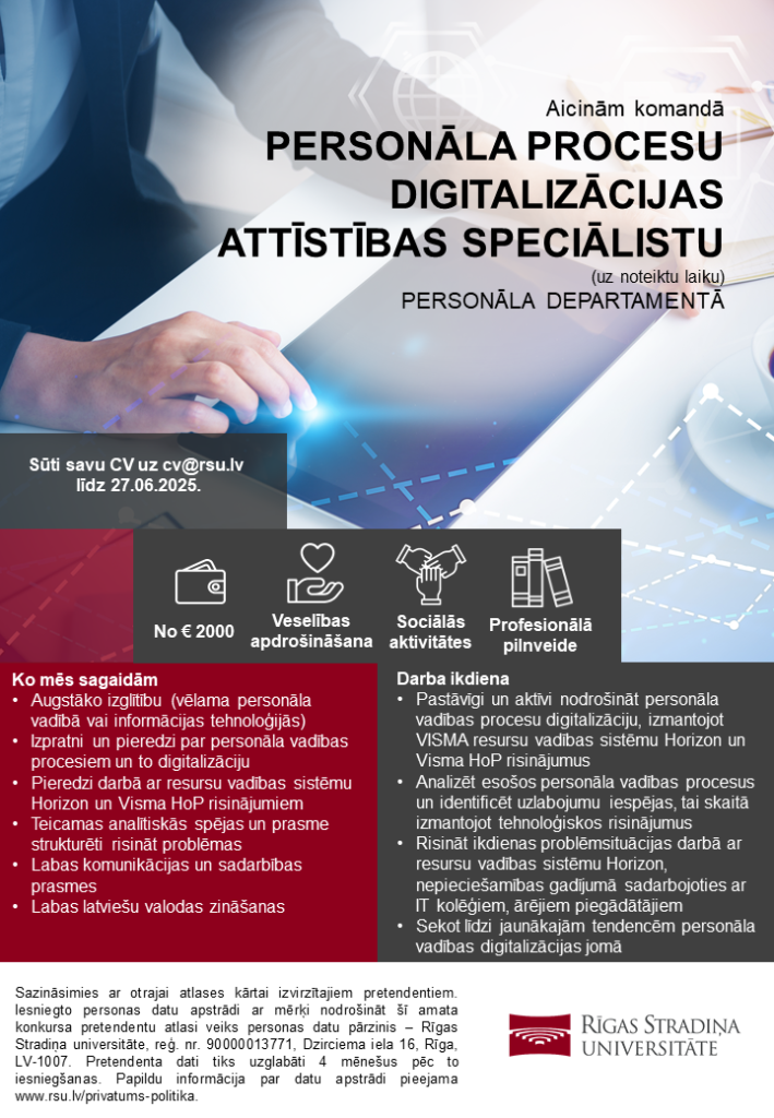 Struktūrvienība vai projektsPersonāla departamentsPieteikšanās līdz27.06.2025.Darba alga (bruto)no EUR 2000Vietu skaits1Mēs piedāvājam Personāla departamentsPersonāla departaments17 Mellužu iela, RigaTelpa: 202., 207.-210.Tālrunis: +37167409181E-pasts: personals [at] rsu.lvSkatīt kartē