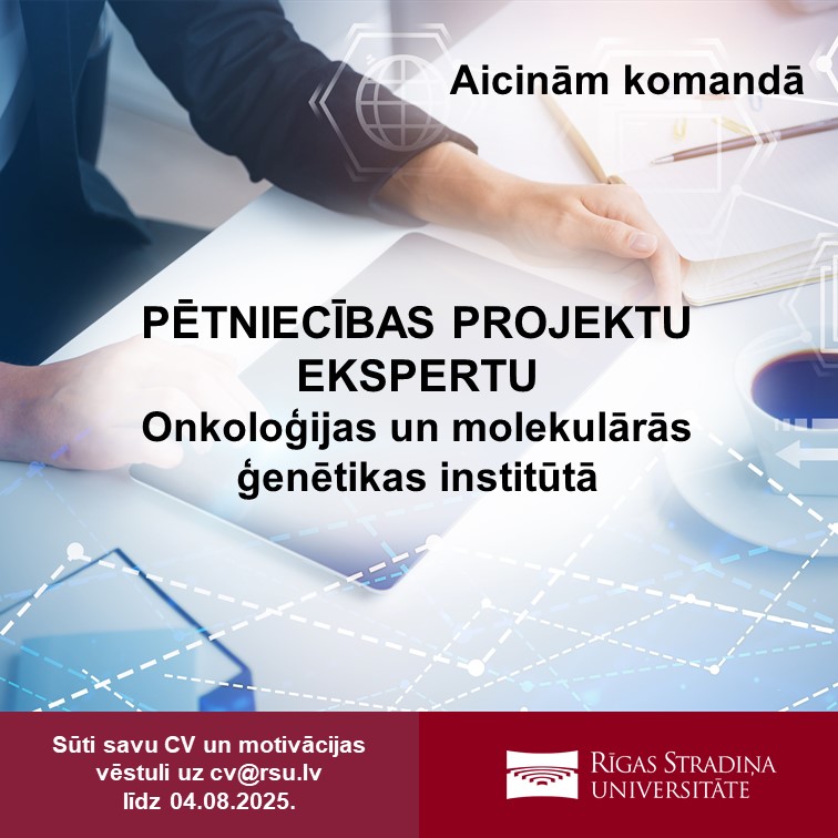 RSU Onkoloģijas un molekulārās ģenētikas institūts aicina pievienoties komandai ekspertu, kas būtu gatavs un spējīgs strādāt ar Eiropas Savienības, reģionālo un nacionālo fondu programmām, medicīnas pētniecību un citām dabaszinātņu jomām. Eksperta amata mērķis būs veicināt finansējuma piesaisti, projektu pieteikumu sagatavošana, kā arī iespējamo sadarbības partneru piesaisti RSU Onkoloģijas un molekulārās ģenētikas institūtā.