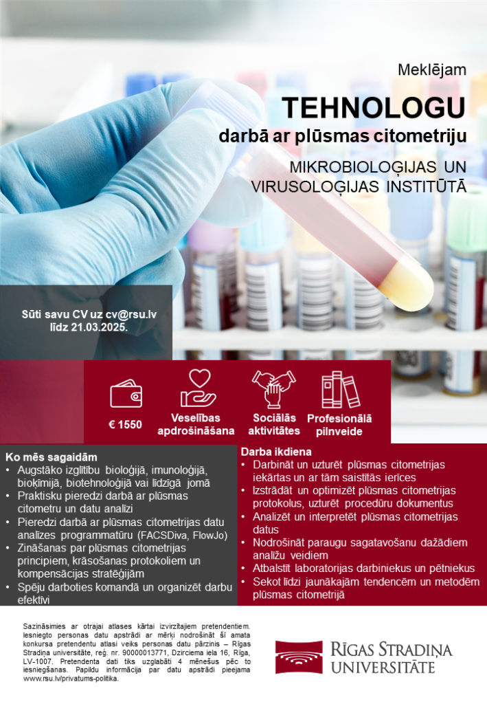 Struktūrvienība vai projektsMikrobioloģijas un virusoloģijas institūtsPieteikšanās līdz21.03.2025.Darba alga (bruto)EUR 1550Vietu skaits1Mēs piedāvājam Mikrobioloģijas un virusoloģijas institūtsRSU Zinātnes centrsRātsupītes iela 5, RīgaTālrunis: +37167060837 E-pasts: zcmvi [at] rsu.lvSkatīt kartē