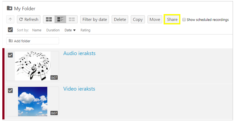 Atzīmējiet, ar kuriem no tikko augāšupielādētajiem failiem vēlaties dalīties (uzspiediet uz video vai audio ieraksta).