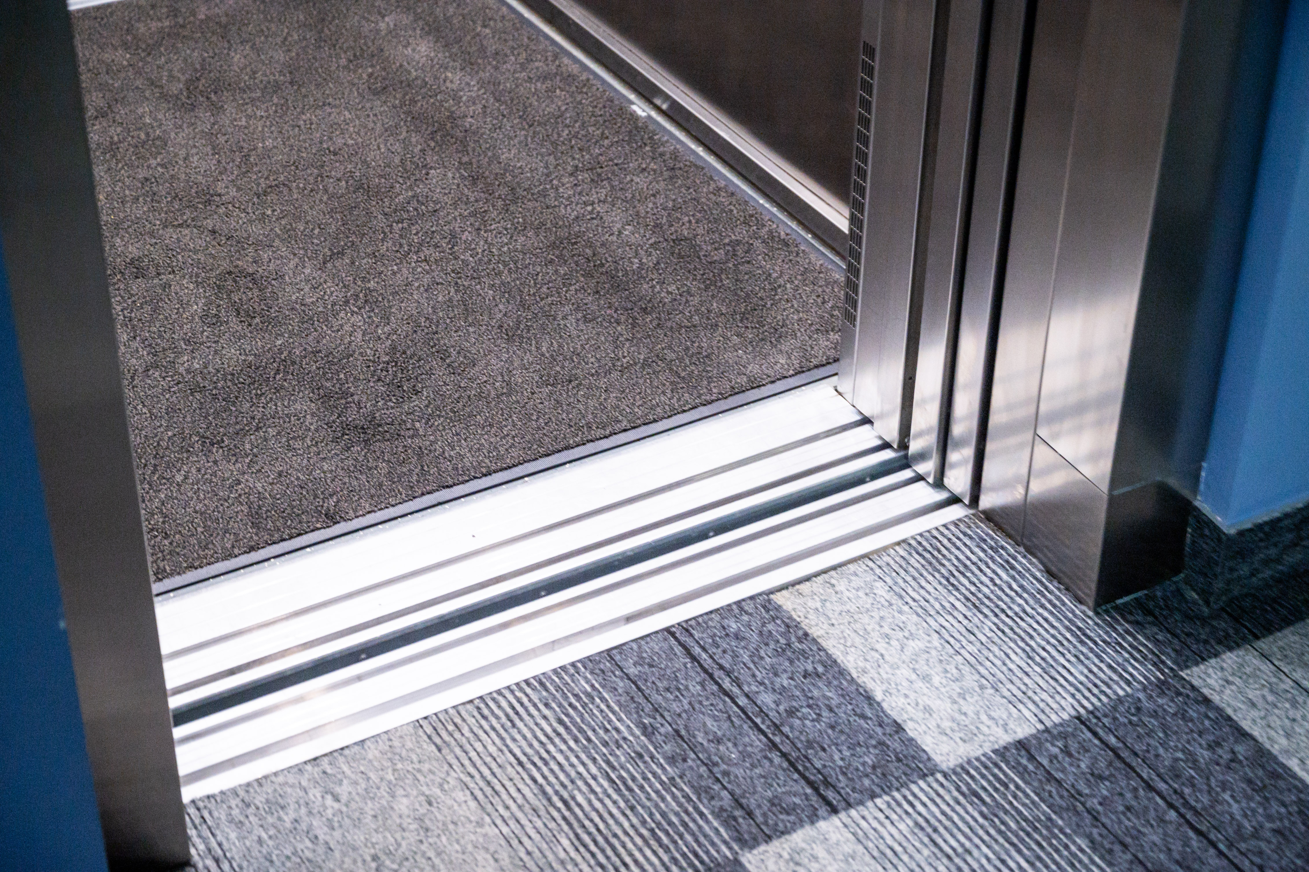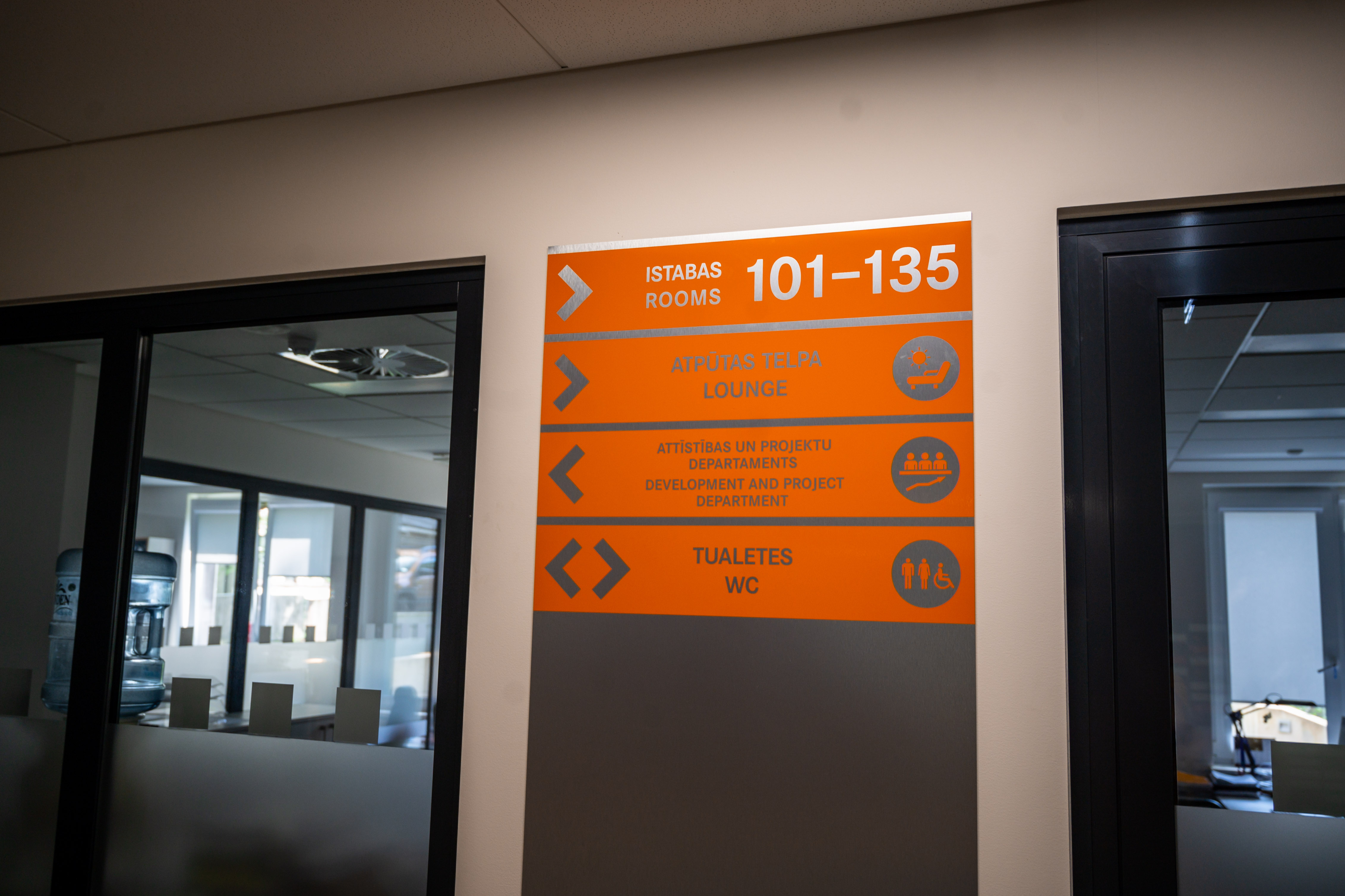 - Durvis un stiklotās sienas ar kontrastējošu marķējumu