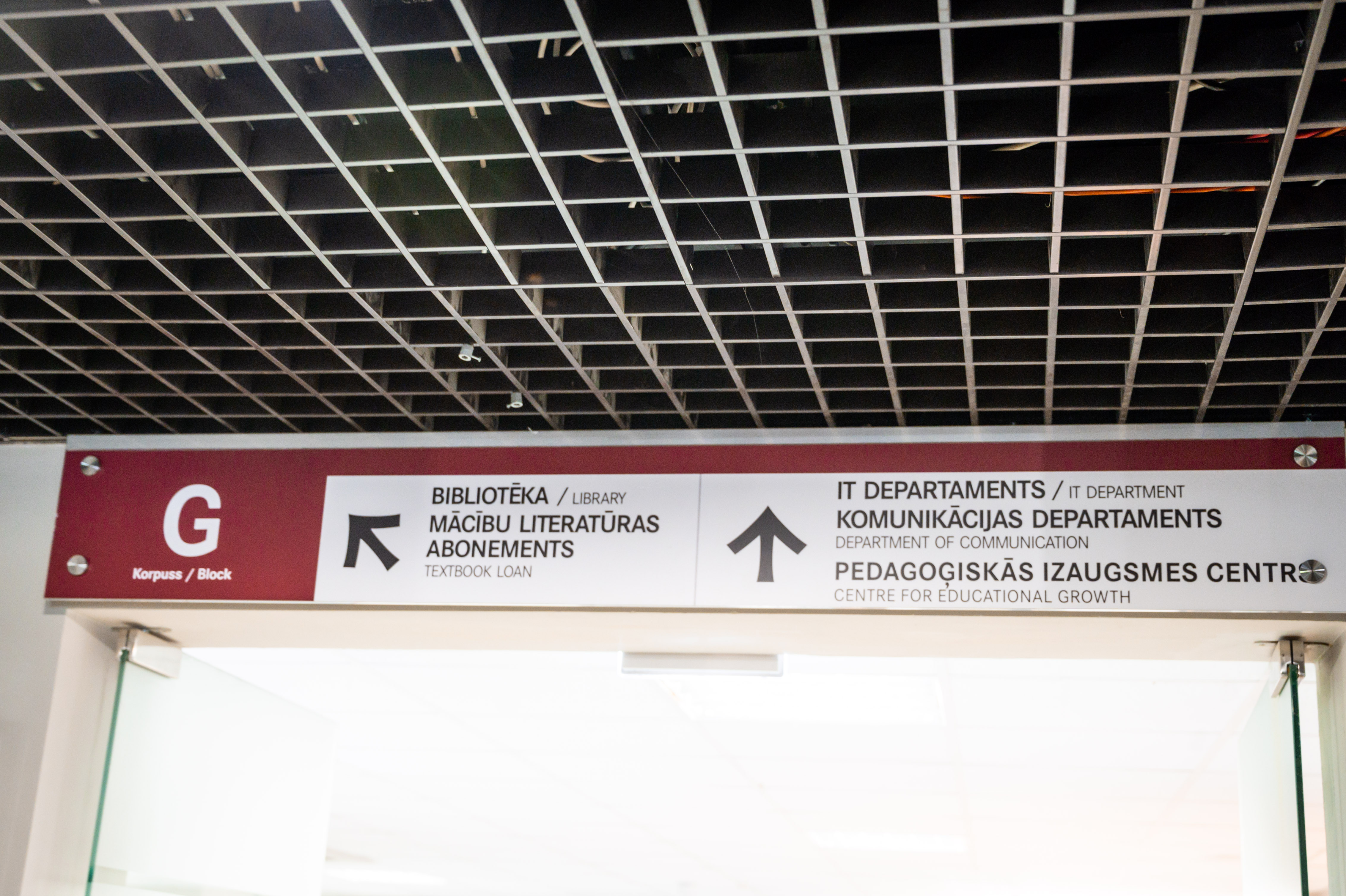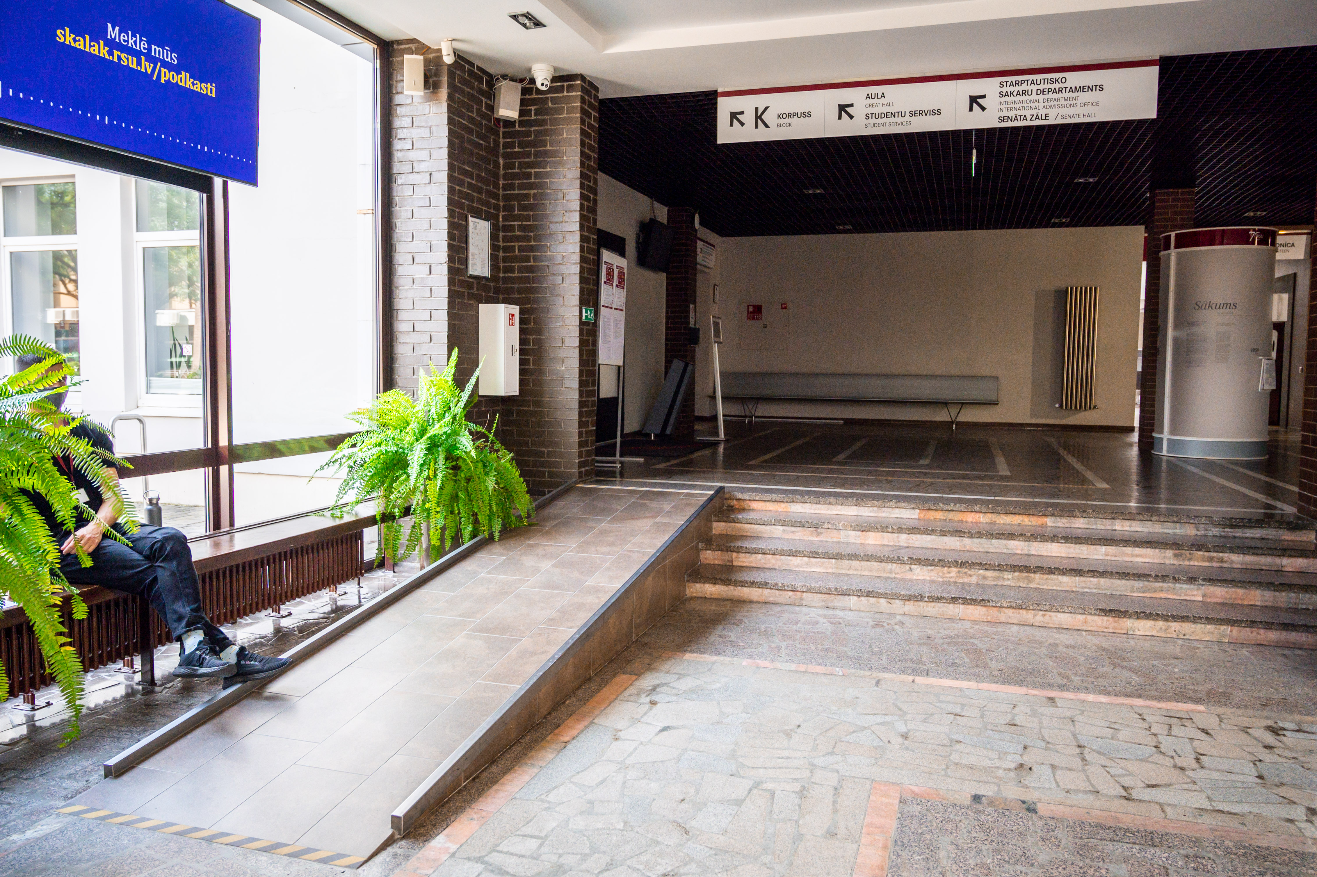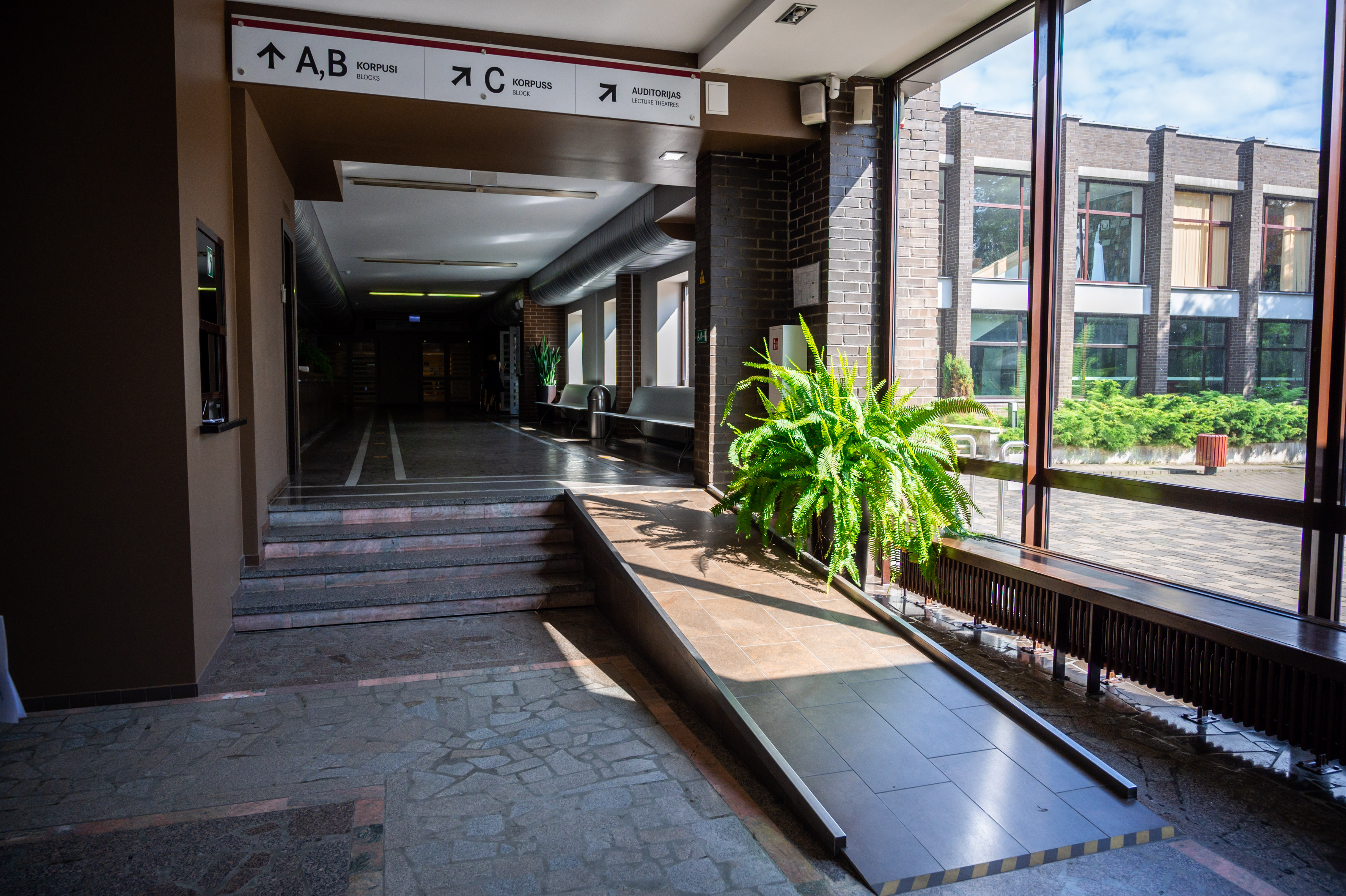 - Pirmajā stāvā, vestibilā, ierīkots panduss, lai nokļūtu uz visiem ēkas korpusiem – garderobi, ēdnīcu, liftiem, bibliotēku, brīvpieejas kopēšanas iekārtām, aulu utt.