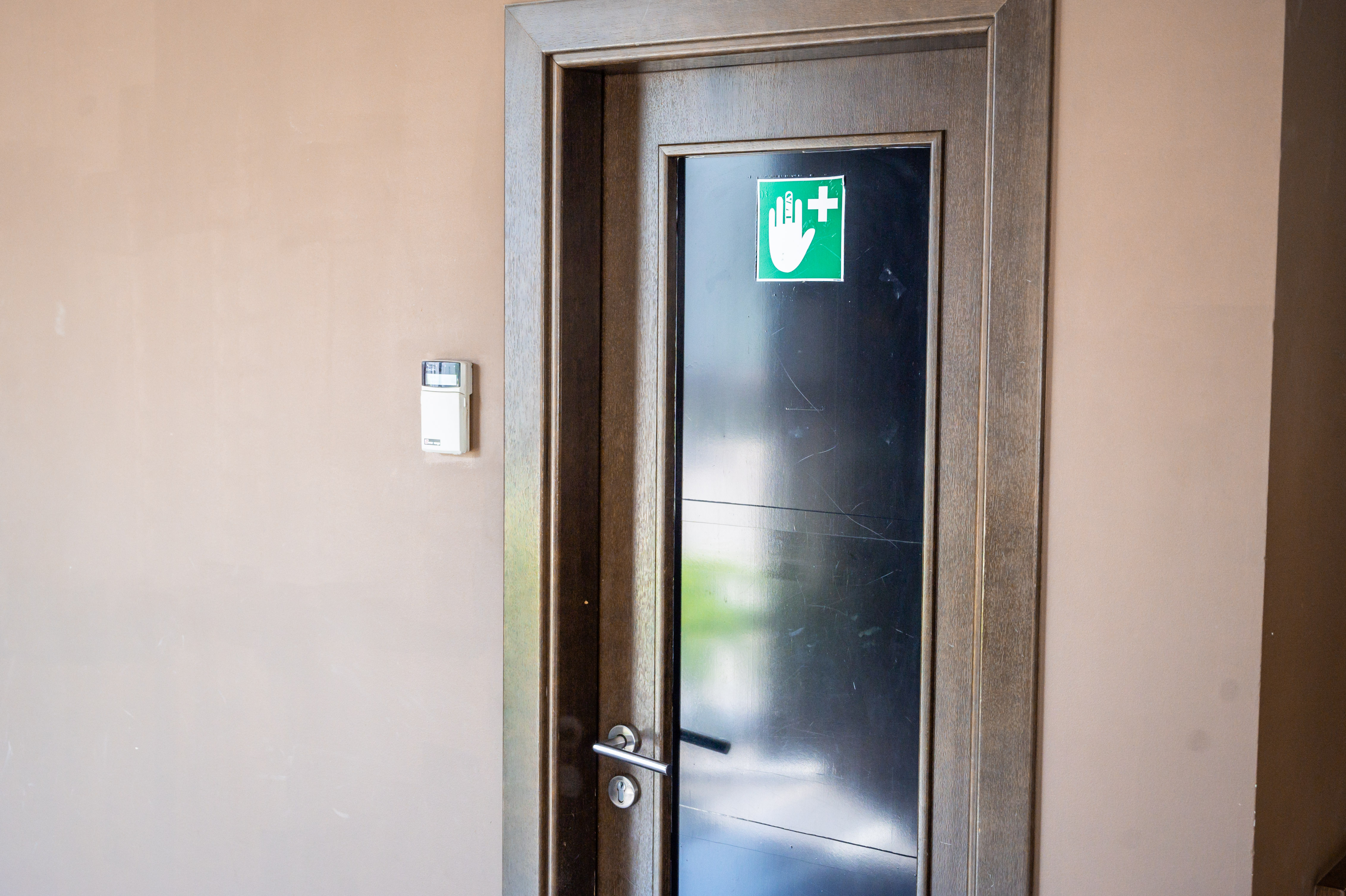 - Durvis un stiklotās sienas ar kontrastējošu marķējumu