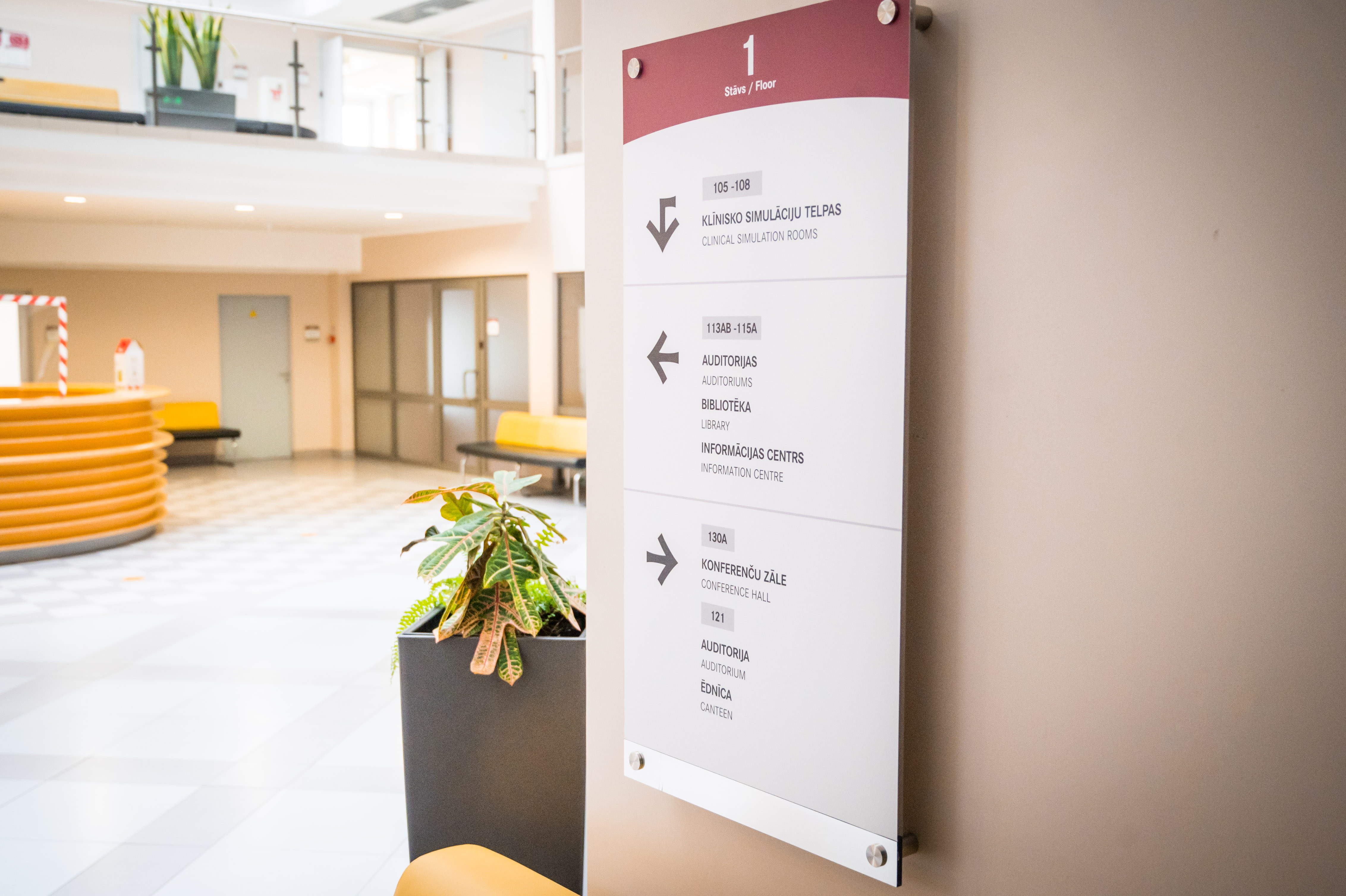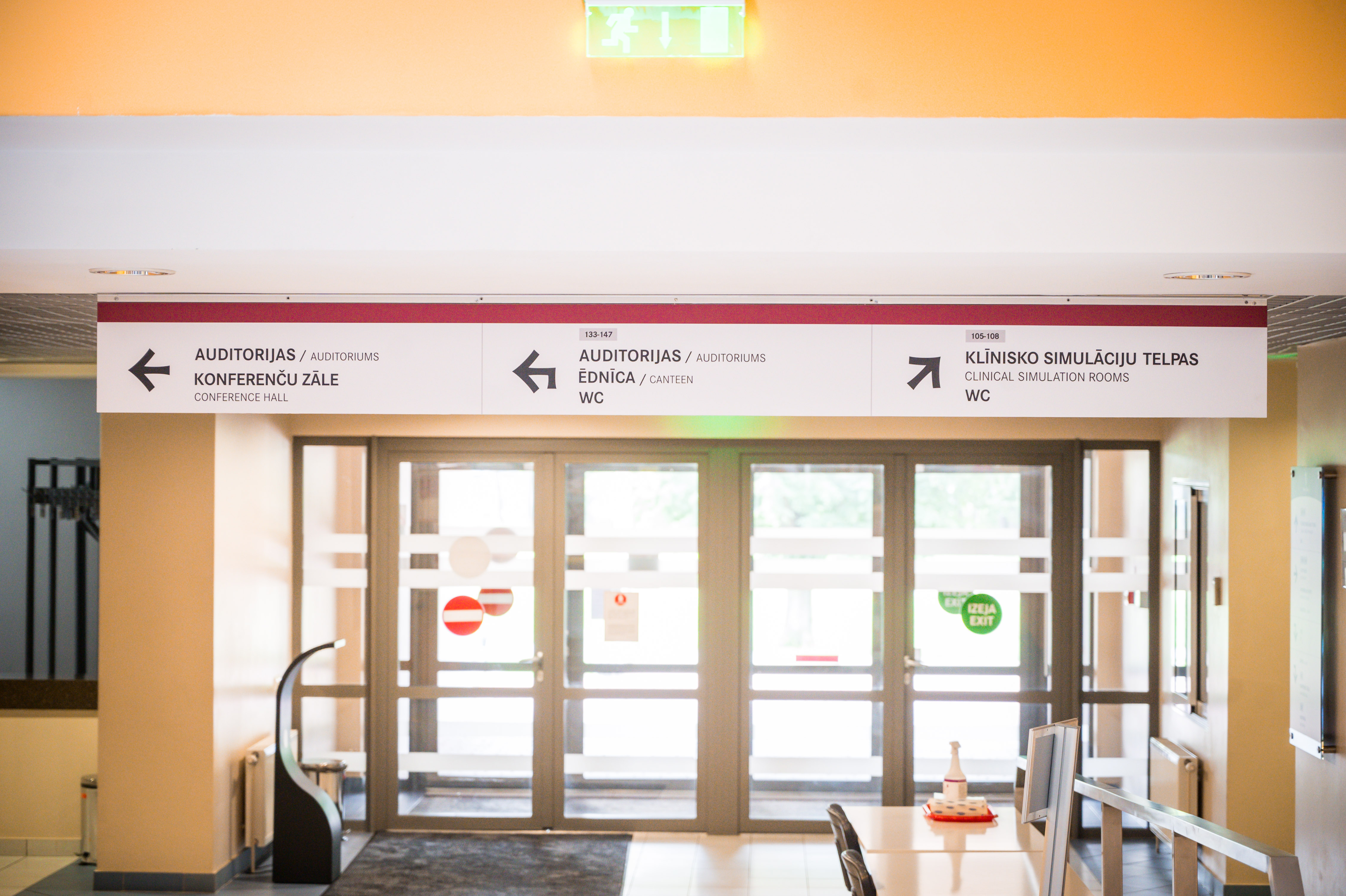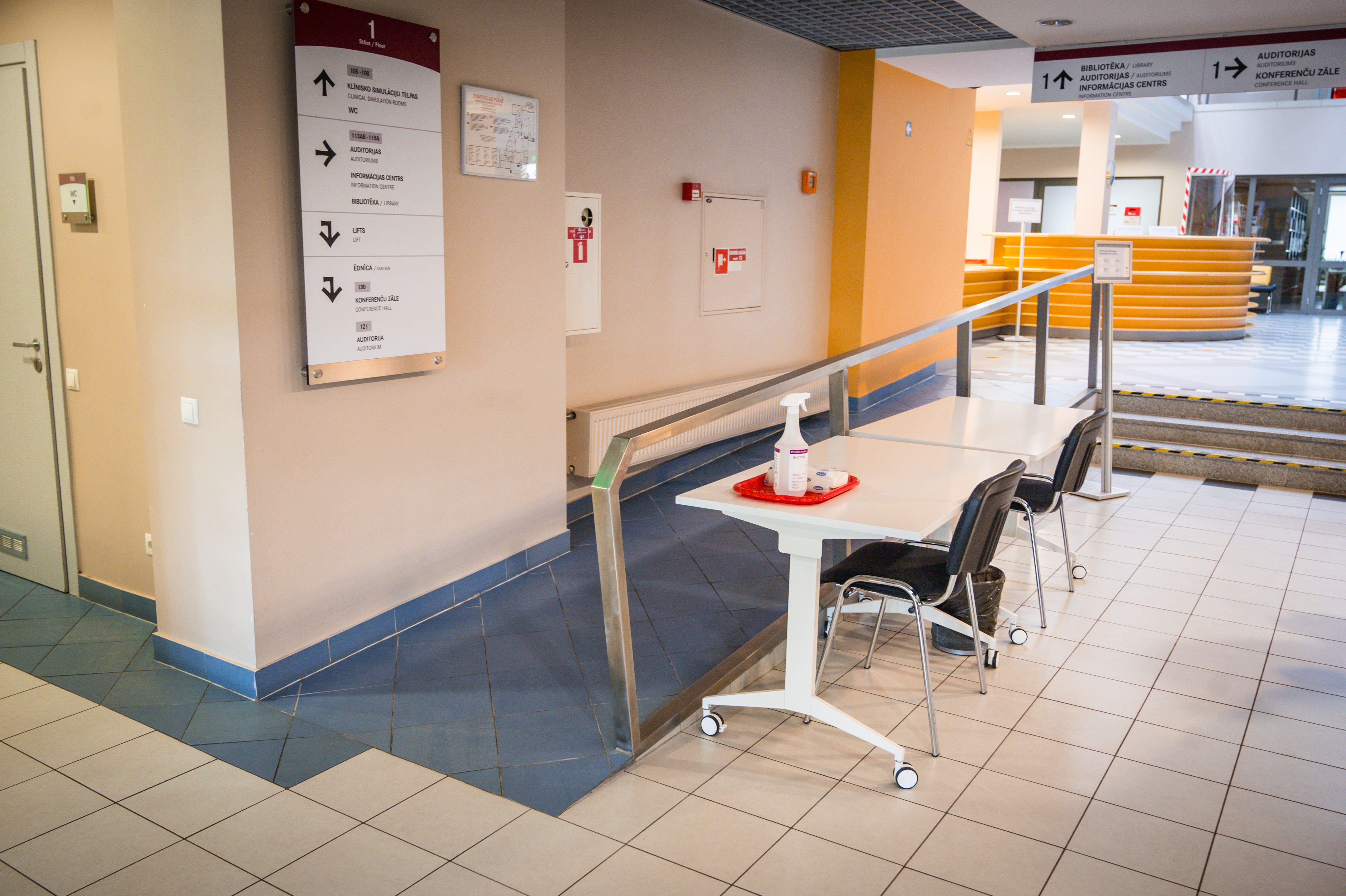 - Panduss vestibilā, lai nokļūtu uz ēdnīcu, liftu, garderobi, bibliotēku, brīvpieejas kopēšanas iekārtām u. c.