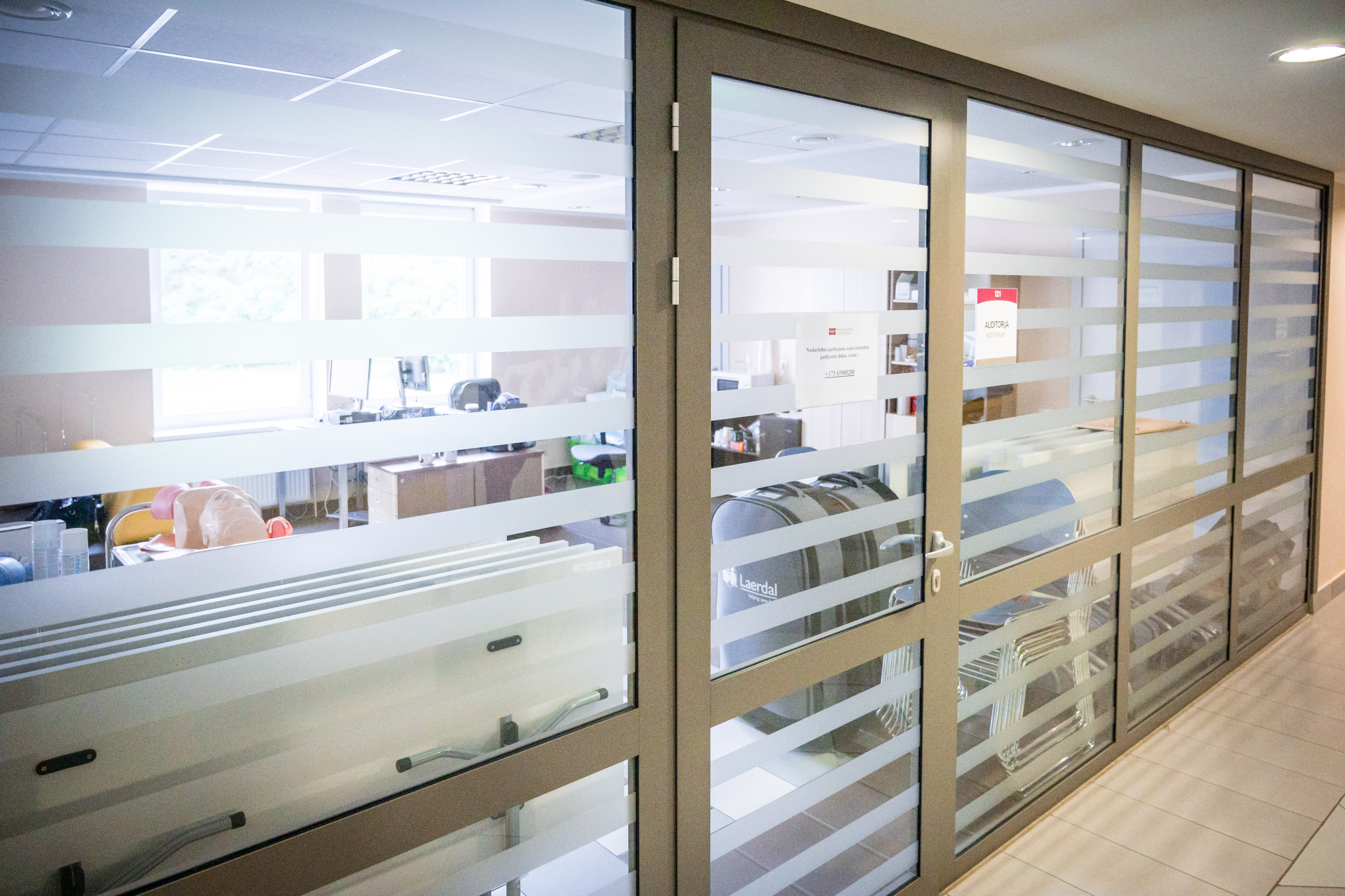 - Durvis un stiklotās sienas ar kontrastējošu marķējumu