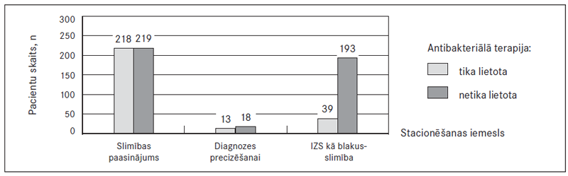 Antibakteriālā terapija lietota 325 (46,4 %) gadījumos: 218 (49,8 %) pacientiem, kas steidzami stacionēti IZS paasinājumu dēļ, 13 (41,9 %) pacientiem, kas stacionēti diagnozes precizēšanai, un 39 (16,8 %) pacientiem, kuriem IZS bijusi blakusdiagnoze (sk. 1. att.).