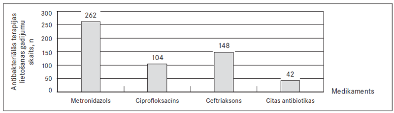 Ciprofloksacīns izmantots 104 (14,9 %) gadījumos, metronidazols – 262 (37,4 %) un ceftriaksons – 148 (21,1 %) gadījumos, citas antibiotikas lietotas 42 (6,0 %) gadījumos (sk. 2. att.). Terapijā izmantotas arī šādas antibakteriālo līdzekļu kombinācijas: ciprofloksacīns un metronidazols – 73 (10,4 %) gadījumos, ceftriaksons un metronidazols – 90 (10,4 %) un ciprofloksacīns, metronidazols un ceftriaksons – 12 (1,7 %) gadījumos.