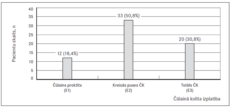 Statistiski ticamas atšķirības slimības izplatībā starp pacientiem ar ESBL producējošo Enterobacteriaceae dzimtas baktēriju kolonizāciju un bez ESBL producējošo Enterobacteriaceae dzimtas baktēriju kolonizācijas netika novērotas. Lielākajai daļai (n = 33 jeb 50,8 %) ČK pacientu tika konstatēts kreisās puses (E2) kolīts, sk. 7. att.