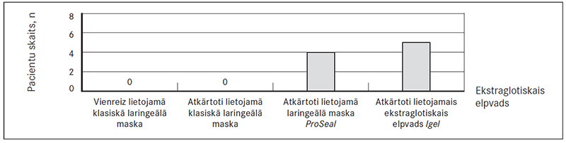 Ievietot ar pirmo reizi neizdevās, tikai lietojot laringeālo masku ProSeal – 4 gadījumos no 24 – un Igel – 5 gadījumos no 29 (sk. 3. att.).