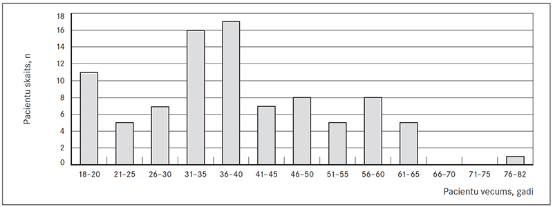 Prospektīvā pētījumā tika iekļauti 90 pacienti vecumā no 18 līdz 82 gadiem, vidējais pacientu vecums bija 39,08 ± SD 15,1 gads (sk. 1. att.).