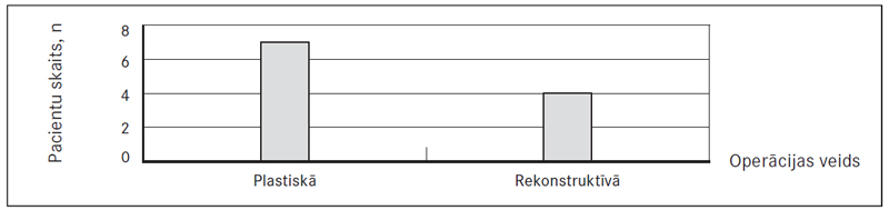 No 11 pacientiem ar pārejošām nepatīkamām sajūtām kaklā 7/25 (28 %) bija pēc plastiskām estētiskām operācijām, bet 4/60 (6,7 %) pacientiem – pēc plastiskām rekonstruktīvām operācijām (p = 0,018) (sk. 2. att.).
