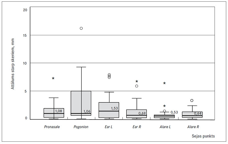 Klīniski nozīmīga atšķirība starp diviem skeniem pogonion punktā tika novērota 15 (37,5 %) indivīdiem. Kopumā atšķirība bija robežās no 0,5 līdz 16,1 mm, un 10 indivīdiem tā bija lielāka par 4 mm. Citā viduslīnijas punktā – pronasale – klīniski nozīmīga atšķirība starp diviem skeniem tika novērota astoņiem (20 %) indivīdiem. Šī atšķirība bija robežās no 0 līdz 7,2 mm, un vienam indivīdam tā bija lielāka par 4 mm.