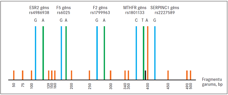 2. attēls. Shematisks fragmentu analīzes attēls, pieņemot, ka indivīds ir heterozigotisks pēc visām atlasītajām ģenētiskajām variācijām / Schematic figure of fragment analysis for theoretycal individual, who is heterozygous for all selected genetic variations