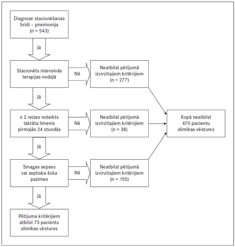 Tika veikts retrospektīvs pētījums, analizējot pacientu medicīniskās kartes no Rīgas Austrumu klīniskās universitātes slimnīcas un Paula Stradiņa Klīniskās universitātes slimnīcas arhīva materiāliem par pacientiem, kuri tika stacionēti intensīvās terapijas nodaļā. Pētījuma veikšana saskaņota ar Rīgas Stradiņa universitātes Ētikas komiteju. Apkopoti dati par laika periodu no 2012. gada janvāra līdz 2014. gada maijam par pacientiem, kuri atbilst pētījumā izvirzītajiem kritērijiem (sk. 1. att.).