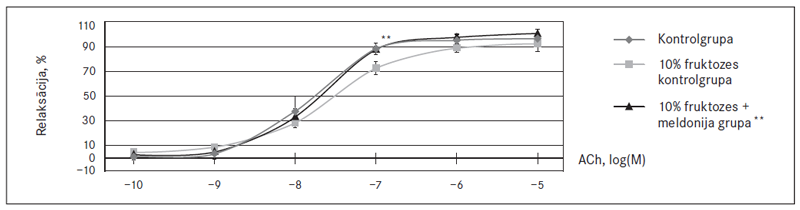 No endotēlija atkarīgā aortu gredzenu atslābšana 10-7M acetilholīna ietekmē fruktozes kontrolgrupas žurkām statistiski ticami atšķīrās par 17 %, salīdzinot ar kontrolgrupu, kas liecina par agrīniem endotēlija funkcionalitātes traucējumiem (sk. 5. att.). Maksimālā endotēlija relaksācija 10-7M acetilholīna ietekmē pēc četru nedēļu ilgas meldonija ievadīšanas dislipidēmijas modelī statistiski ticami atšķīrās par 17 %, salīdzinot ar fruktozes kontrolgrupu (sk. 5. att.).