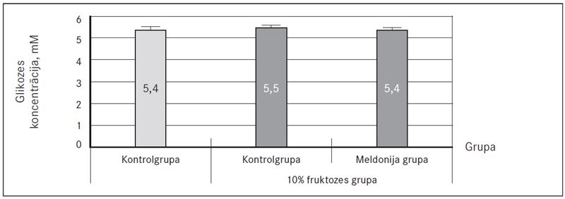 Eksperimenta beigās glikozes koncentrācija asinīs kontrolgrupas žurkām bija 5,4 ± 0,2 mM un neatšķīrās no fruktozes kontrolgrupas žurkām. Meldonija (200 mg/kg) četru nedēļu ilga ievadīšana glikozes koncentrāciju plazmā žurkām neietekmēja (sk. 1. att.).