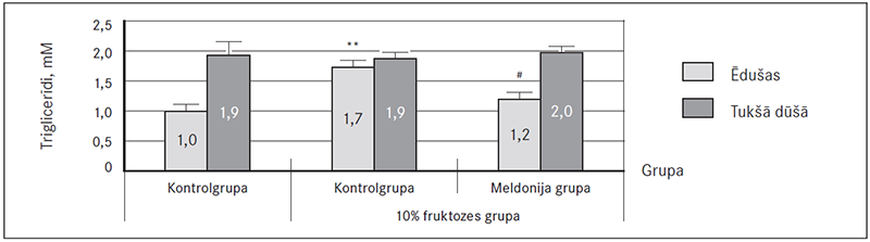 Kā redzams 4. attēlā, triglicerīdu koncentrācija plazmā fruktozes kontrolgrupas žurkām bija palielināta 1,7 reizes tikai ēdušām žurkām. Meldonija (200 mg/kg) četru nedēļu ilga ievadīšana ēdušām žurkām triglicerīdu koncentrāciju plazmā statistiski ticami samazināja par 31 %. Wistar žurkām tukšā dūšā, salīdzinot ar kontrolgrupas žurkām, ne astoņu nedēļu fruktozes šķīduma lietošana, ne četru nedēļu ilga meldonija ievadīšana triglicerīdu koncentrāciju plazmā neietekmēja (sk. 4. att.).