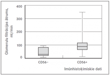 Mūsuprāt, CD56 antigēna ekspresijas trūkumam ir zināma loma biežākas MM komplikācijas – nieru mazspējas – attīstībā, jo tās lielumi, līdzīgi kā p53, statistiski ticami korelē ar samazinātu GFĀ un paaugstinātu kreatinīna līmeni. Lielāka daļa autoru, piemēram, Sahara et al., 2002; Hundemer et al. 2007, pierāda CD56 antigēna lomu MM agresivitātes prognozē, uzsverot, ka CD56 negativitāte visbiežāk ir saistīta ar mielomas šūnu zemāku diferenciāciju (Dunphy et al., 2007).