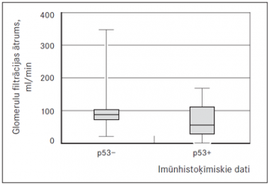 Pacientiem ar izteiktu p53 ekspresiju mielomas šūnās bija noteikta statistiski ticama korelācija ar samazinātu GFĀ (sk. 4. att.) un paaugstinātu kreatinīna līmeni serumā (sk. 5. att.).
