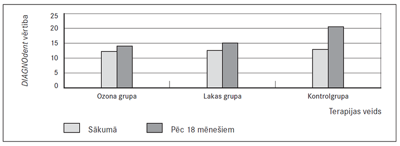 Vidējais DIAGNOdent rādījums ir parādīts 2. tabulā. Sākotnējais DIAGNOdent rādījums starp grupām neatšķīrās. Tāda pati situācija tika novērota arī pēc 6 un 12 mēnešiem. Taču pēc 18 mēnešiem starp testa un kontroles grupām DIAGNOdent rādījumos parādījās atšķirības (sk. 1. att.). Starp grupu, kuras molāri tika pārklāti ar laku, un kontroles grupu tika novērota statistiski ticama atšķirība (p < 0,05), tāpat kā starp grupu, kuras molāri tika apstrādāti ar ozonu, un kontroles grupu (p < 0,01). Kontroles grupā novēroja būtiskas demineralizācijas pazīmes. Netika atrastas statistiski nozīmīgas atšķirības DIAGNOdent rādījumos starp pirmo (lakas) un otro (ozona) testa grupu (p > 0,05).