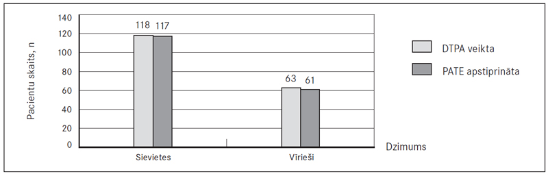Datortomogrāfijas plaušu angiogrāfijas rezultāti. Datortomogrāfijas plaušu angiogrāfija (DTPA) tika veikta 93,7 % (118) sieviešu, no kurām PATE diagnoze apstiprināta 99,2 % (117), un 98,4 % (63) vīriešu, no kuriem PATE apstiprināta 96,8 % (61) gadījumu (sk. 3. att.). Kopsummā DTPA jutība ir ļoti augsta – 98,3 %.