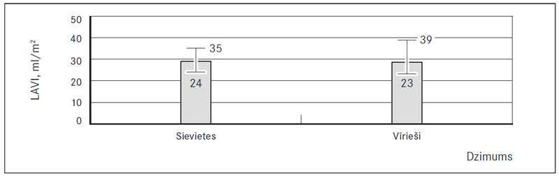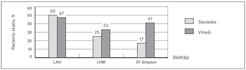 Kreisā priekškambara tilpuma indekss (LAVI) abu dzimumu pacientiem bija paaugstināts (48,8 % jeb 61) – 29,0 (24; 35) ml/m2 sievietēm un 28,5 (23; 39) ml/m2 vīriešiem (sk. 12., 15. att.). Kreisā kambara masas indekss (LVMI) abiem dzimumiem atbilda normai, attiecīgi 87,6 (± 20,1) g/m2 un 111,9 (± 34,1) g/m2, bet paaugstināts šis rādītājs bija 25 % (11) sieviešu (LVMI > 95 g/m2) un 33,3 % (10) vīriešu (LVMI > 115 g/m2) (sk. 13., 15. att.). Izsviedes frakcija (EF Simpson) vīriešiem atradās pie normas apakšējās robežas, vidēji 55,0 % (45; 60) (samazināta 41,2 % jeb 21 vīrietim) un bija statistiski ticama atšķirība (p = 0,009) no sievietēm, kurām izsviedes frakcija atbilda normai 60,0 % (55; 60) (samazināta tikai 17,4 % jeb 16 sievietēm) (sk. 14., 15. att.).
