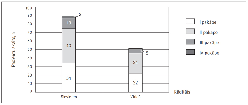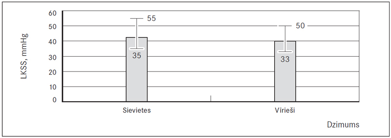 Labā priekškambara laukums (RAA) virs normas tika konstatēts abu dzimumu pacientiem (58,7 % jeb 81), taču statistiski ticami augstāks tas bija vīriešiem 21,7 (± 6,7) cm2 nekā sievietēm 19,4 (± 5,4) cm2 (p = 0,029) (sk. 8., 11. att.). Savukārt labā kambara bazālais diametrs (RVD1) abiem dzimumiem atbilda normai – 38,6 (± 5,9) mm sievietēm un 40,5 (± 5,8) mm vīriešiem, bet paaugstināts šis rādītājs (RVD1 > 42 mm) bija 33,1 % (45) pacientu (sk. 9., 11. att.). Labā kambara sistoliskais spiediens (LKSS) bija paaugstināts abiem dzimumiem (76,3 % jeb 103) – sievietēm 42,5 (35; 55) mm Hg un vīriešiem 40,0 (33; 50) mm Hg (sk. 10., 11. att.).