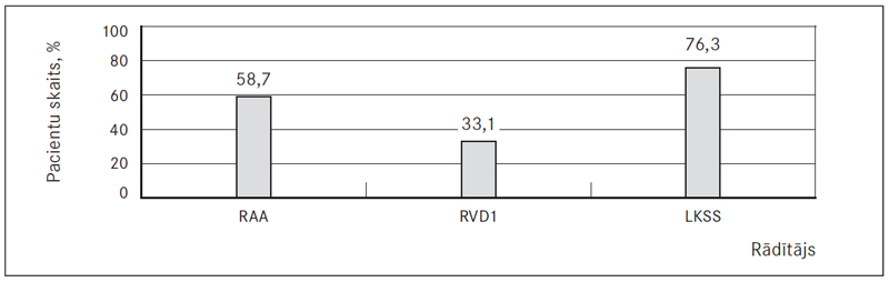 RAA – labā priekškambara laukums / right atrium area, RVD1 – labā kambara bazālais diametrs / right ventricular basal diameter, LAVI – kreisā priekškambara tilpuma indekss / left atrium volume index, LVMI – kreisā kambara masas indekss / left ventricular mass index, LKSS – labā kambara sistoliskais spiediens / right ventricular systolic pressure, EF Simpson – izsviedes frakcija / ejection fraction, MR – mitrālā regurgitācija / mitral valve regurgitation, TR – trikuspidālā regurgitācija / tricuspidal valve regurgitation.