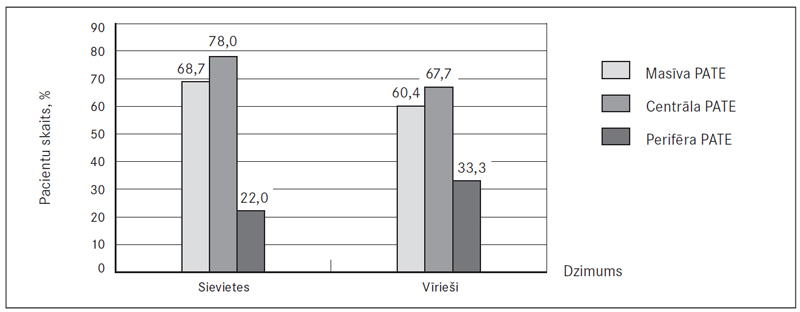 - Masīva PATE novērojama 68,7 % sieviešu un 60,4 % vīriešu, bet centrāla PATE vērojama 78,0 % sieviešu un 66,7 % vīriešu.