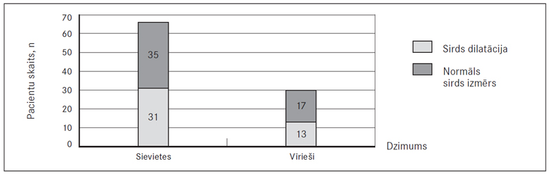 7. attēls. Datortomogrāfijas plaušu angiogrāfijā noteiktais sirds dilatācijas biežums / Heart dilatation confirmed by computerised tomographic pulmonary angiography