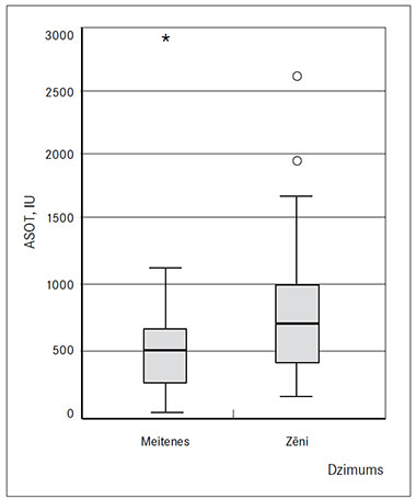 Salīdzinot laboratoriskos izmeklējumus starp abiem dzimumiem, statistiski ticamu atšķirību novēroja starp ASOT (p = 0,034) un EGĀ (p = 0,031) līmeņa salīdzinājumiem – zēniem tā bija statistiski ticami lielāka (izmantots Manna–Vitnija tests) (sk. 4. un 5. att.). 1.–4. attēlā atsevišķi ir apzīmētas vistālāk novietotās (izlecošās) laboratorisko izmeklējumu vērtības.