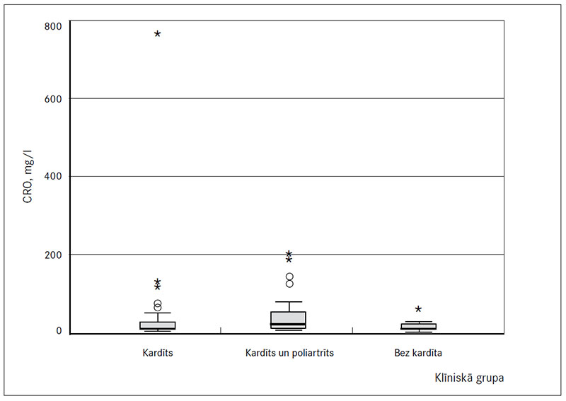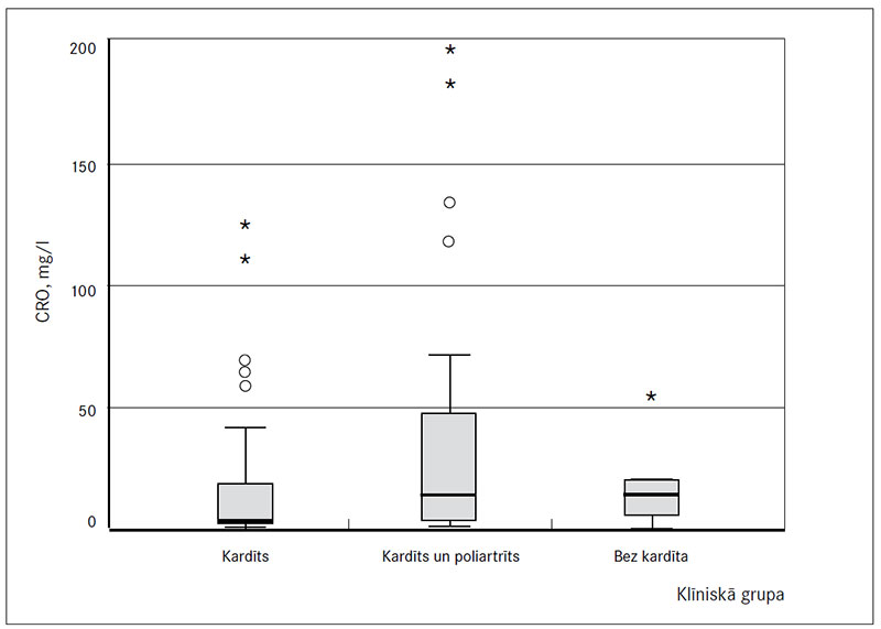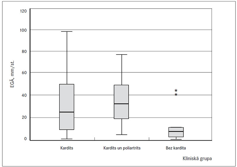 Pētījuma gaitā pacientiem akūtajā RD periodā tika analizēti laboratoriskie izmeklējumi (sk. 3. tab.). Laboratorisko izmeklējumu rezultāti neatbilda normālsadalījumam, lietojot Kolmogorova–Smirnova testu, un turpmāk tika lietota neparametrisko datu statistiskā analīze. Izmantojot Kruskala–Volisa testu, tika noraidīta hipotēze, ka eritrocītu grimšanas ātrums (EGĀ) klīniskajās grupās ar kardītu (n = 39); kardītu un poliartrītu (n = 26); bez kardīta (n = 9) ir vienāds (p = 0,037) (sk. 1. att.). Savukārt pētot antistreptolizīna O titru (ASOT) starp visām klīniskajām grupām, statistiski ticamas izmaiņas netika konstatētas (p = 0,52). ASOT bija paaugstināts visiem primārā RD pacientiem, kas ir būtiski, jo slimība attīstās pēc AGBS infekcijas; pētījuma grupai ASOT vidējā vērtība bija 775,91 IU. C reaktīvā olbaltuma līmenim (CRO) (p = 0,74) un kopējam leikocītu skaitam (WBC) (p = 0,44) statistiski nozīmīga atšķirība starp pacientu klīniskajām grupām netika konstatēta. Analizējot CRO vērtības starp klīniskajām grupām, vienam pacientam tika konstatēts ļoti augsts līmenis, to neskaitot, CRO vērtība bija statistiski ticami paaugstināta pacientiem, kuriem primārais RD noritēja ar kardītu un poliartrītu (p = 0,052) (sk. 2. un 3. att.).
