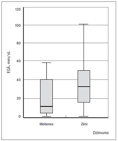 | 4. attēls. Antistreptolizīna O titru (ASOT) līmeņa salīdzinājums starp dzimumiem The comparison of ASOT by genders | 5. attēls. Eritrocītu grimšanas ātruma (EGĀ) salīdzinājums starp dzimumiem The comparison of ESR by genders |